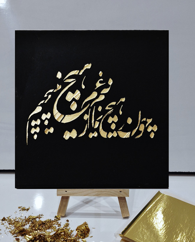 تابلو بوم نقاشیخط برجسته هنری مدرن با شعر < چون هیچ نمانیم زغم هیچ نپیچیم > از دیوان شمس / برجسته و ورقطلا